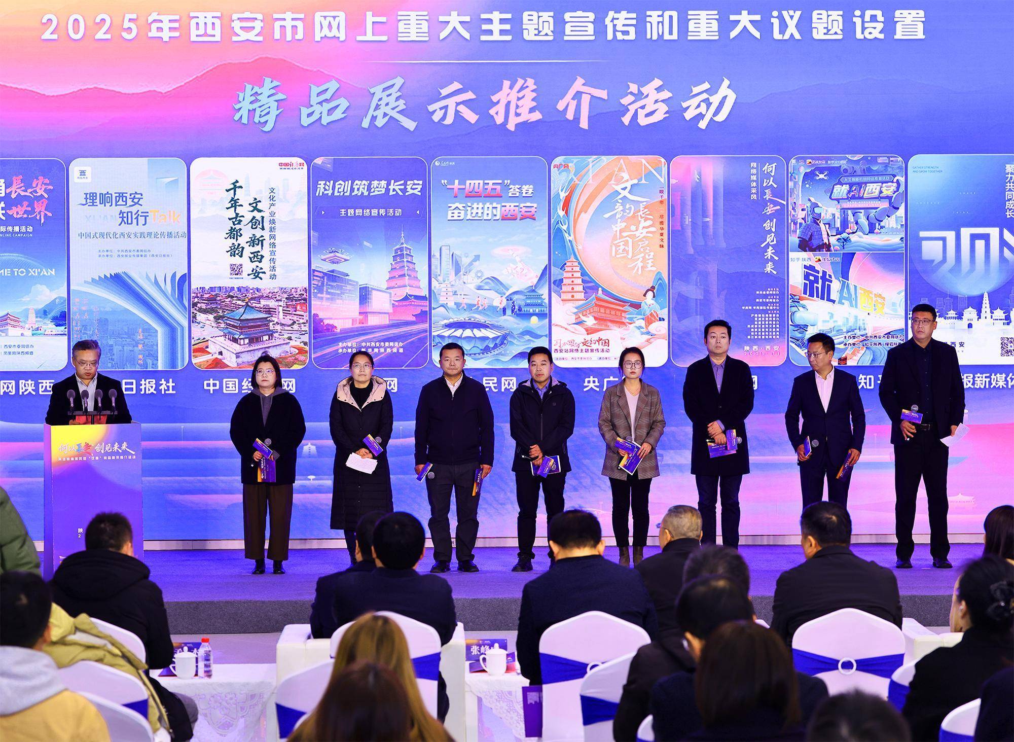 启动仪式上,同步举办2025年西安市网上重大主题宣传和议题设置精品项目展示推介活动,人民网、新华网、央广网、中经网、华商网等十家网络媒体负责人现场分享项目开展情况与传播特色,展现西安网上宣传工作的丰硕成果与多元布局。